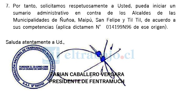 Lo anterior, tiene que ver con las declaraciones que han emitido de manera adelantada en cuanto a estas investigaciones en sus municipalidades; Ñuñoa, Maipú, San Felipe y Tiltil. Estas, según la Fentramuch, son opiniones anticipadas respecto a la sanción a aplicar, lo cual transgredirÃa la imparcialidad del debido proceso.